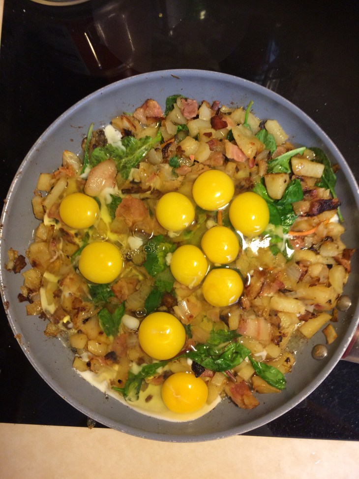 A lot of you have asked how I eat. Here’s an example for breakfast or dinner. Cook 10 strips of bacon cut up into small pieces in a skillet. Add 1 sliced up whole onion. Add a teaspoon of celtic grey sea salt ( available at Amazon.com). Add a teaspoon of garlic powder or cut up some garlic cloves. Stir up and allow to cook until bacon looks done. Peel off the skin and Shred up a whole organic potato. Add potato to skillet and Stir up well. Once the potato shreds are cooked and browned you may then add cage free eggs. In this picture, I added 10 eggs. Stir the eggs into the food and cook until done. I also added some organic spinach leafs, seen in this picture for color and spinach contains lutein which is good for eyes. This could feed 2-4 people depending on one’s appetite. Bon appétit !